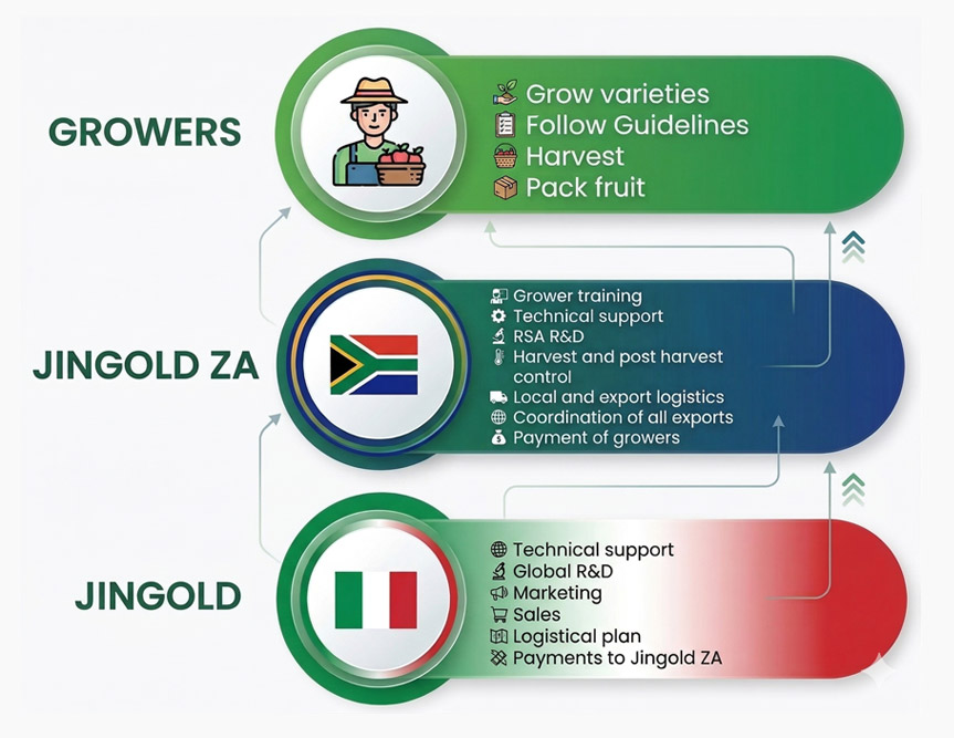 Jingold’s journey in South Africa began in 2016 with the introduction of its proprietary varieties and the establishment of trial blocks to evaluate performance across different regions and environmental conditions. Following successful results, the first commercial orchards were planted in 2020. In 2023, Jingold South Africa Ltd was officially established, marking the start of initial fruit exports to the European Union and a new chapter in the company’s international growth.